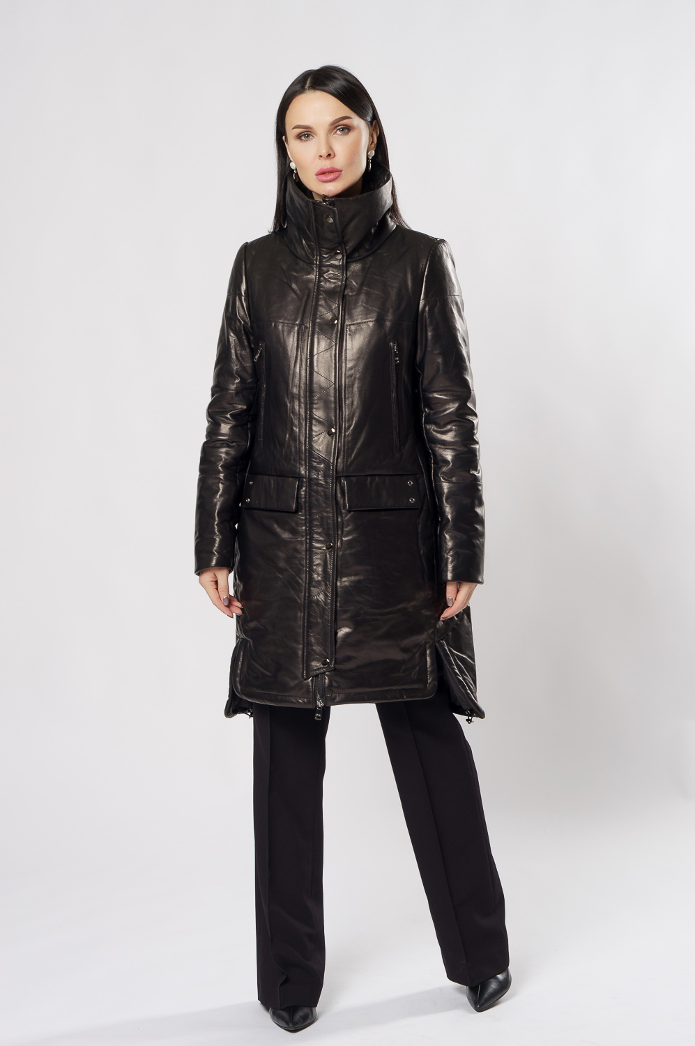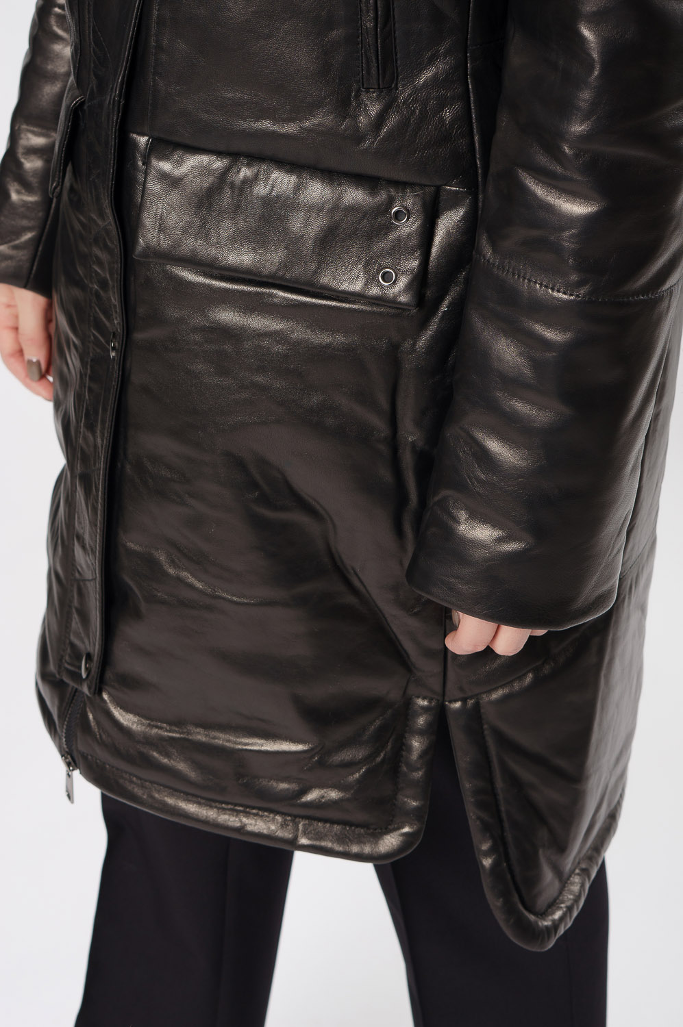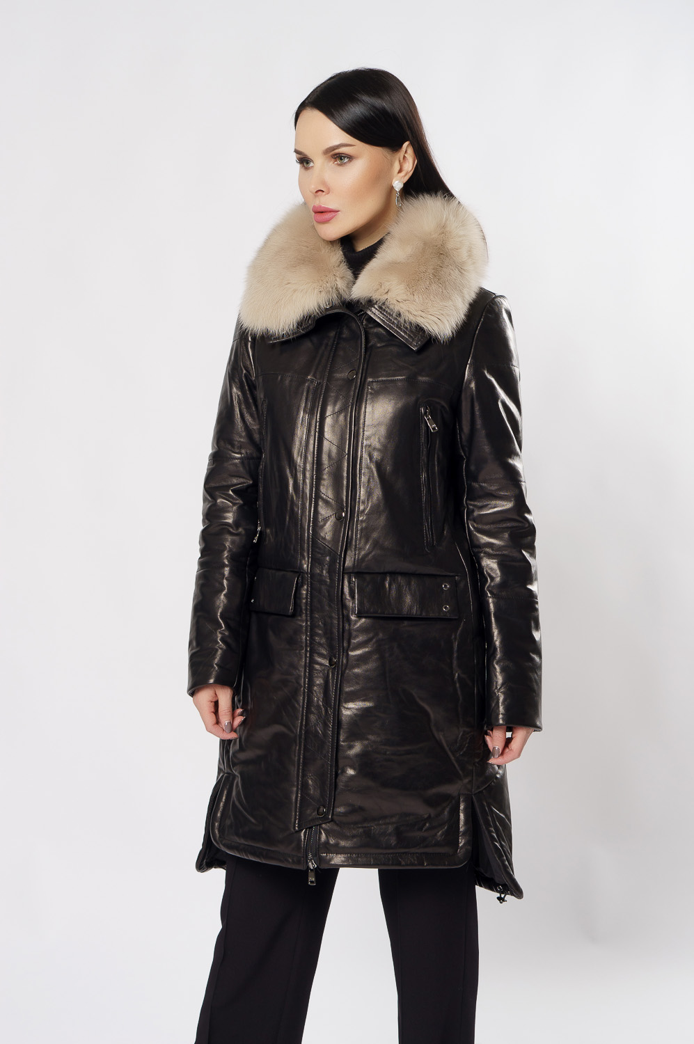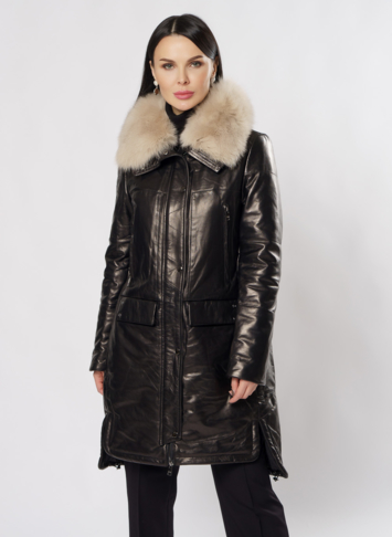 Удлиненный пуховик из натуральной кожи обеспечит тепло и