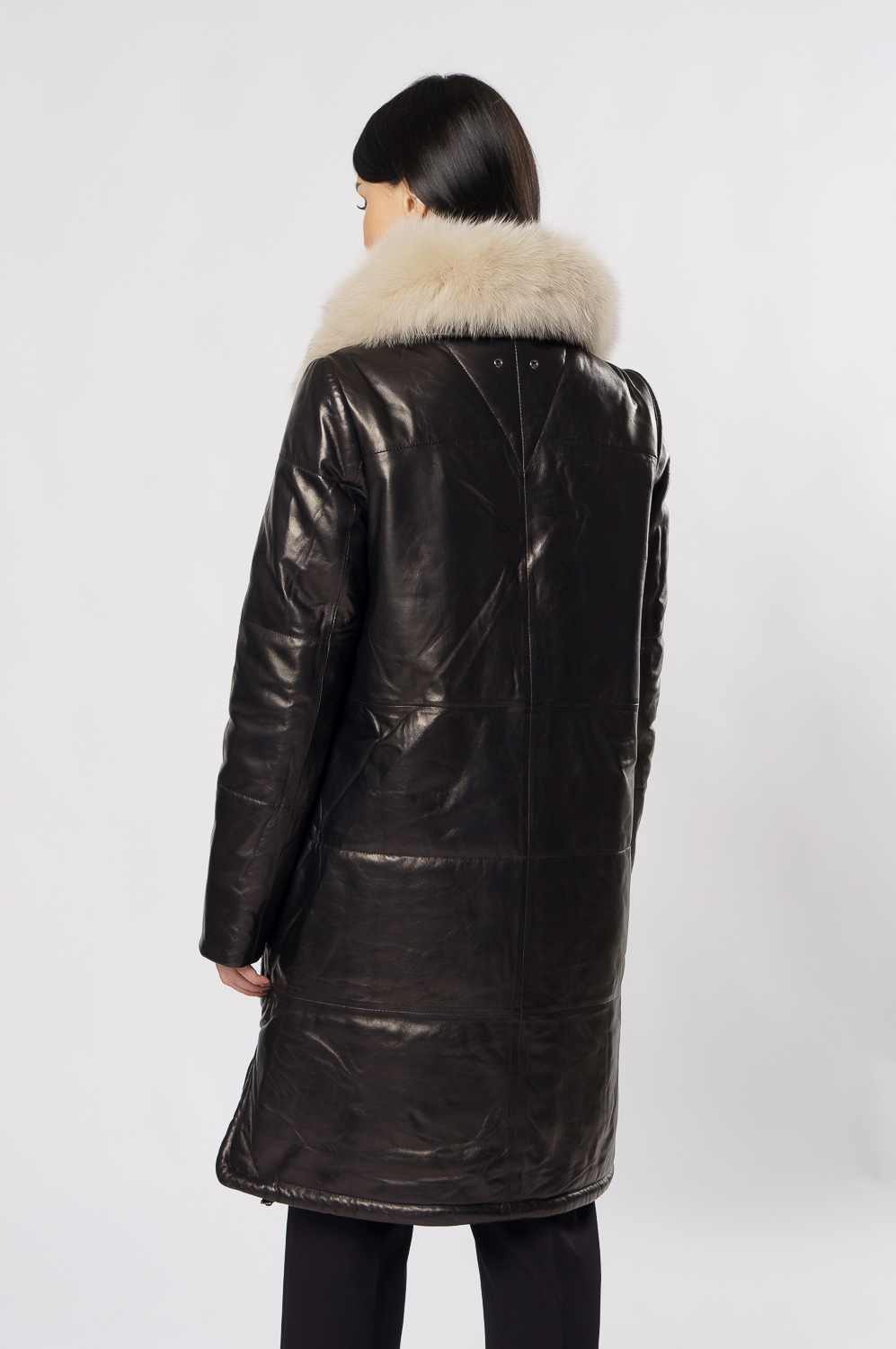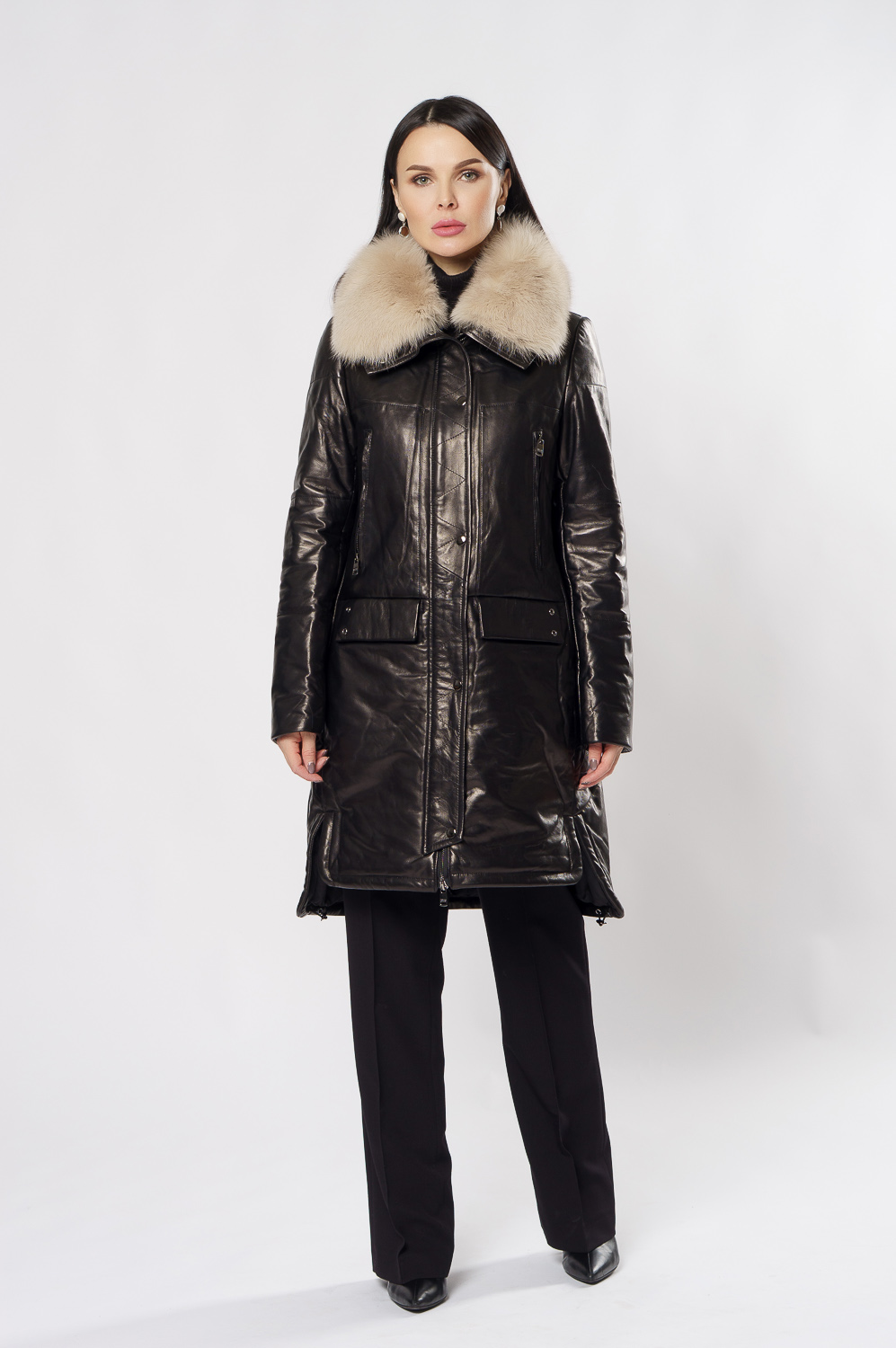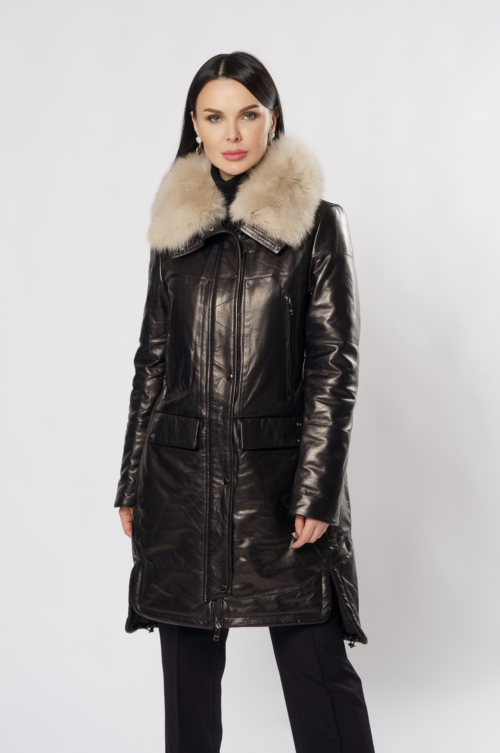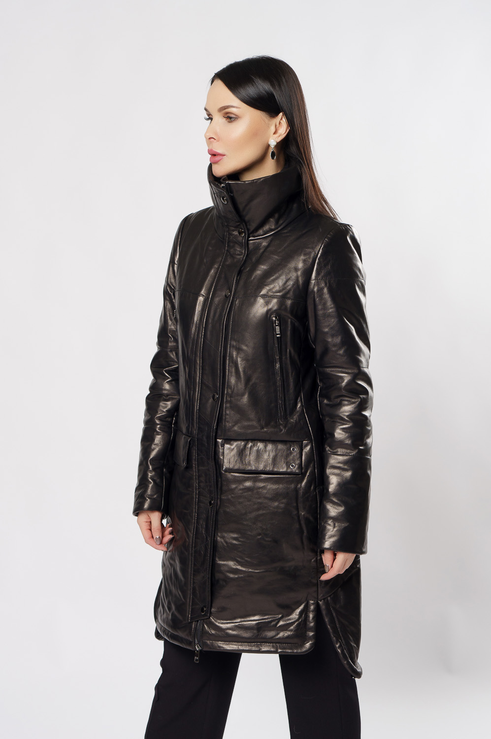 Удлиненный пуховик из натуральной кожи обеспечит тепло и